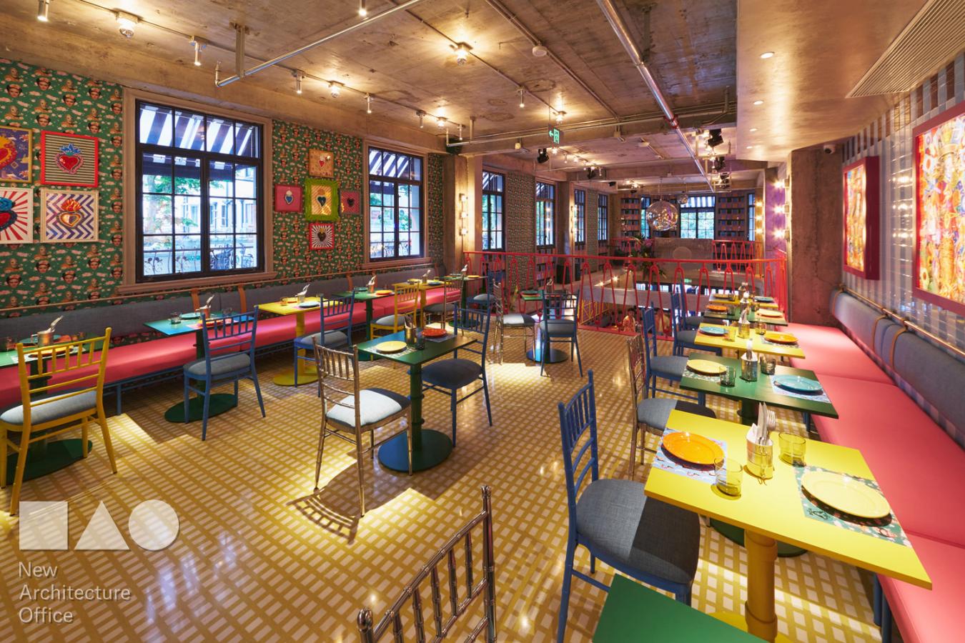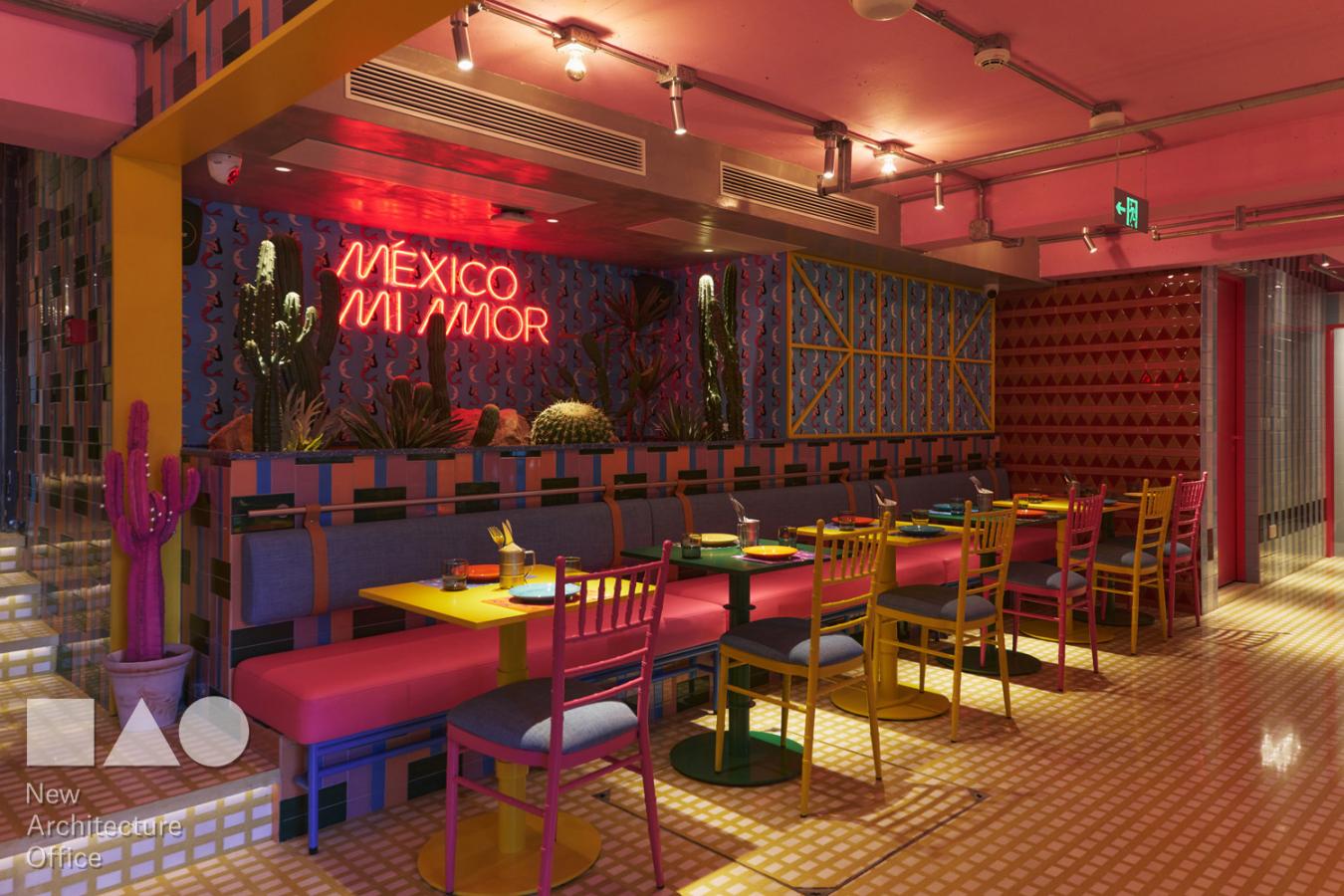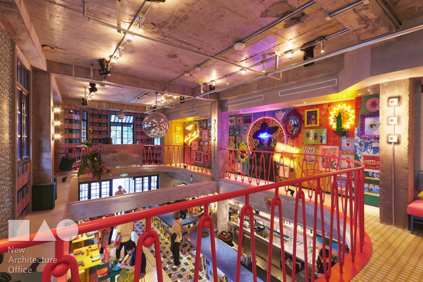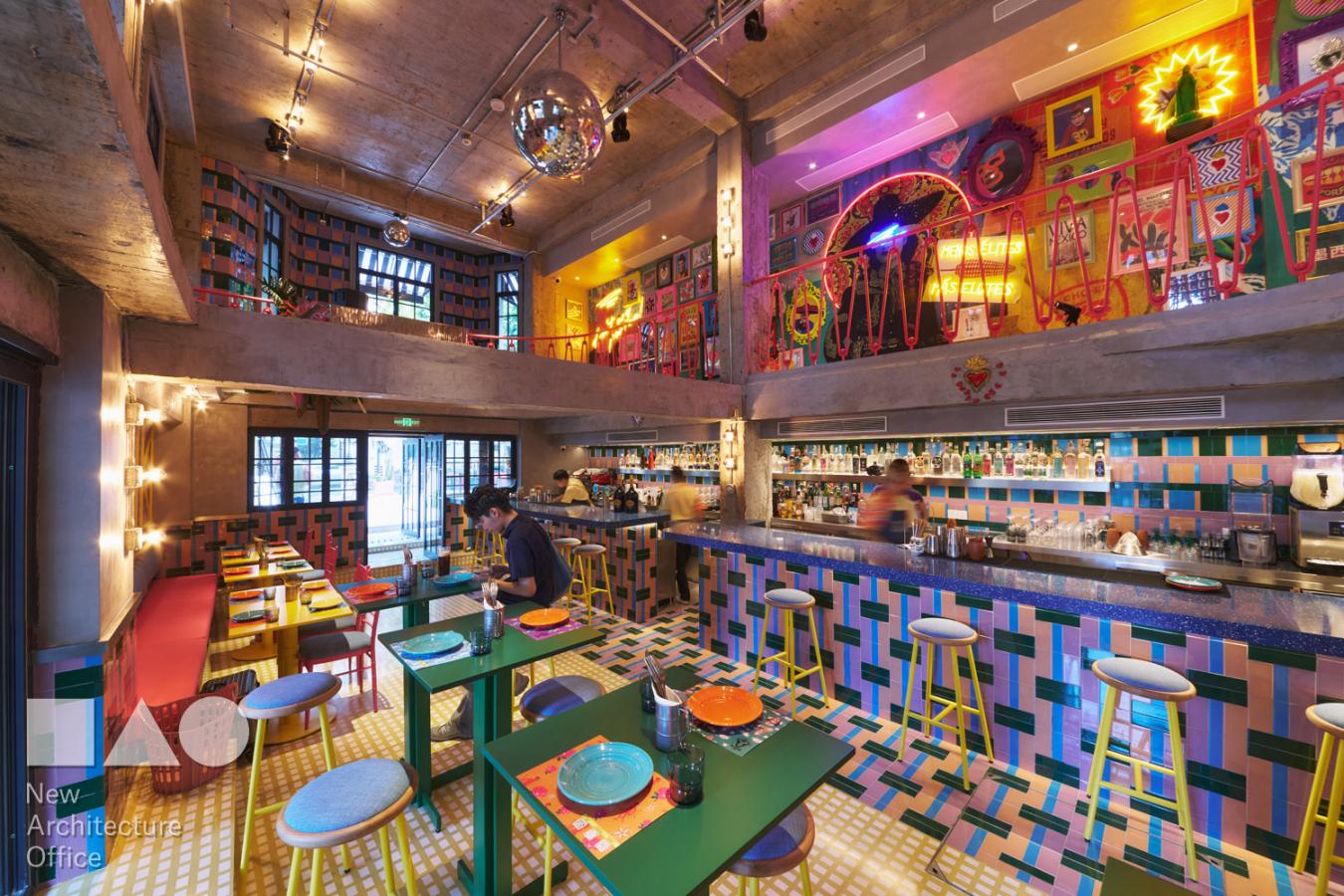 The Project is located on the 1st & 2nd Floor of a heritage building in Xuhui Shanghai. The design transforms the 1st and 2nd floor 274 sq. m. street side interior, along with a large ground level plaza into a lively Taqueria and Latin American Nightlife venue. The Concept creates a lively space inspired by the vibrant energy of Latin American and Mexican culture, reimagined with a playful, modern twist using pink, blue, and yellow tones. The bar celebrates an electric over the top aesthetic that intends to draw in a youthful crowd. Wallpaper and Mural art were designed by the Bottega in house marketing team.