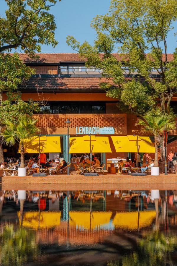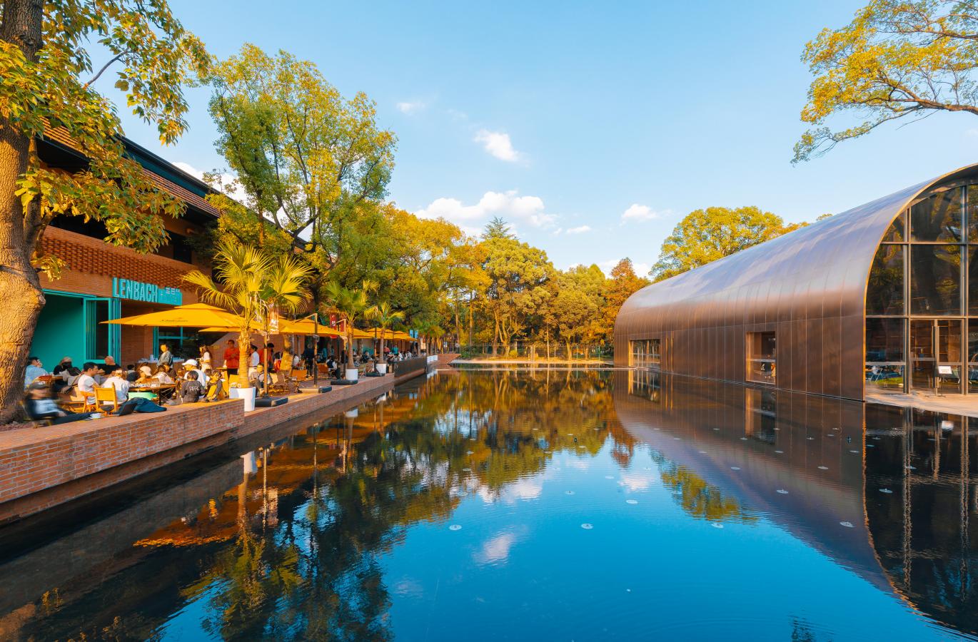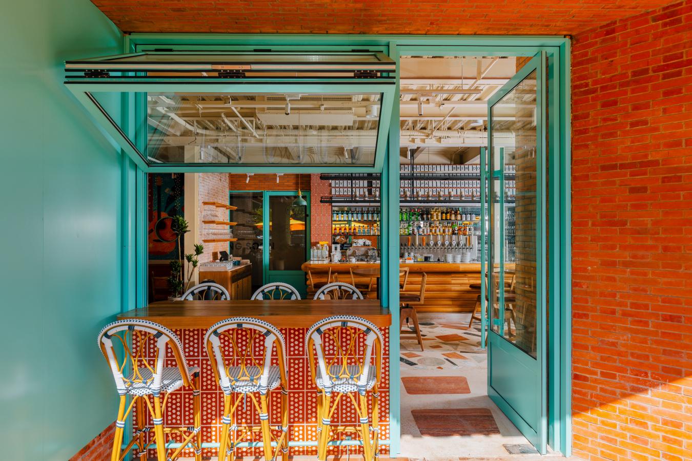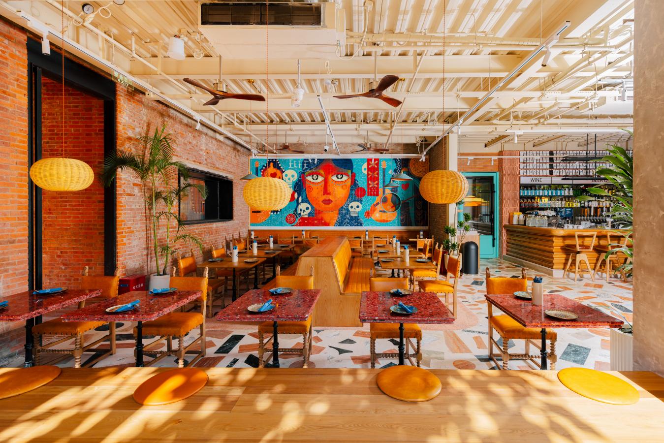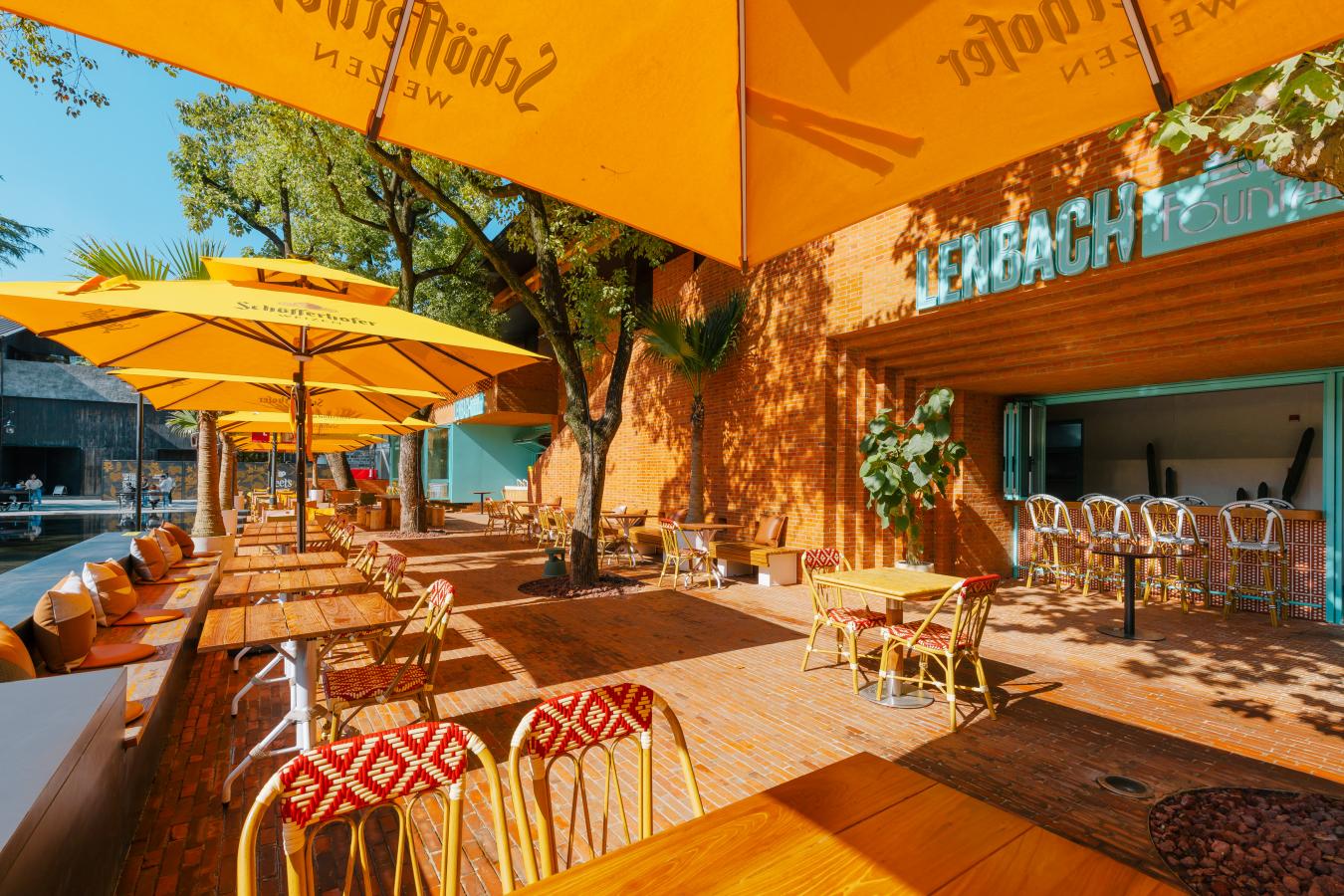 Set within Shanghai Pudong's EKA Architectural Park, Lenbach Fountain's design blends vibrant modern energy with rustic warmth, creating a lively yet relaxed dining environment. The terrace features bold yellow umbrellas, lush greenery, and natural wood furnishings, set against the architectural backdrop of rich red brick walls that give the space a warm, sunlit glow. Inside, the atmosphere continues with colorful murals, eclectic mosaic flooring, and woven pendant lights that add a handcrafted touch. The mix of turquoise frames, rattan textures, and natural tones keeps the space fresh and contemporary, while the open bar and indoor-outdoor flow invite a casual, social dining experience. Altogether, the concept combines artistic flair, playful colors, and cozy materials to create a welcoming destination for both daytime gatherings and evening drinks.