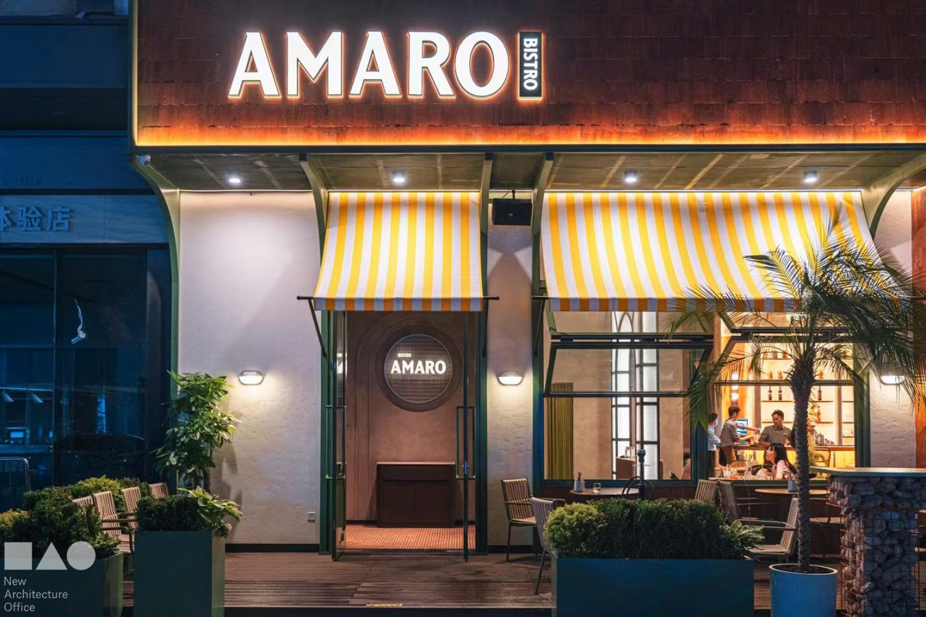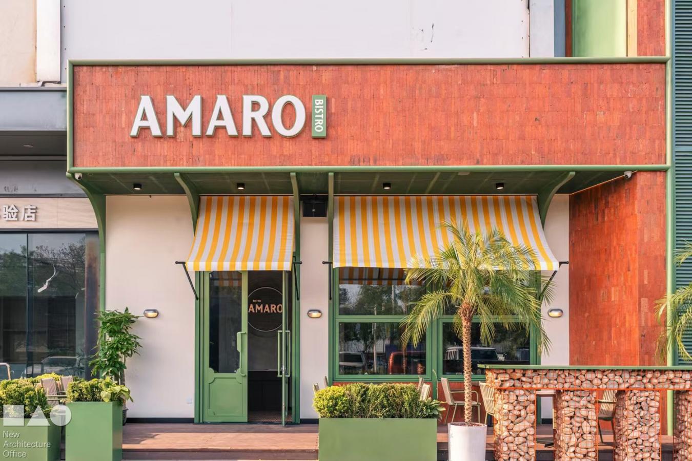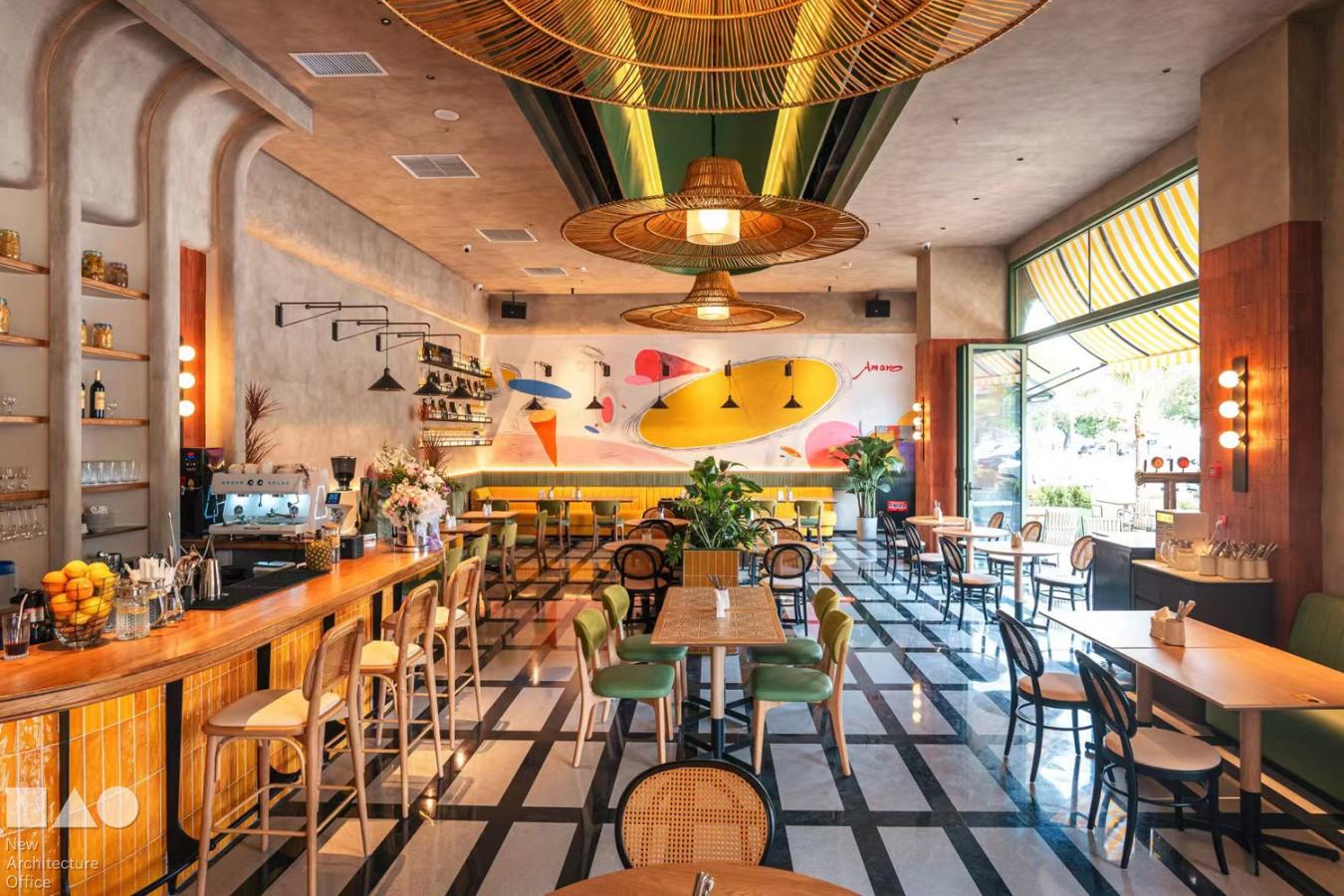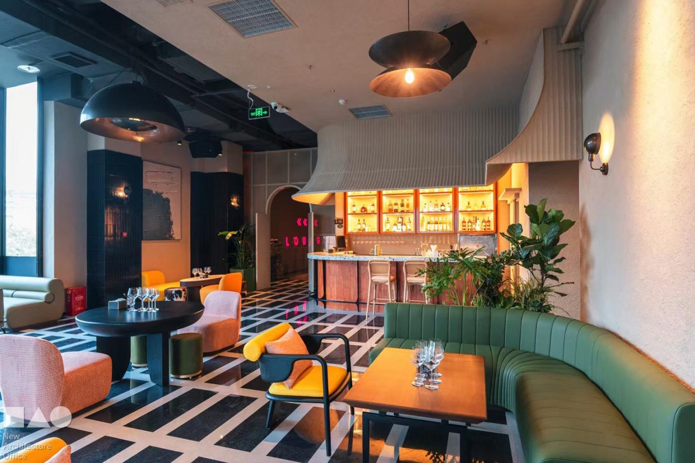 Amaro is two story space located directly across the street from the Beijing Workers stadium. The ground floor and terrace house a mediteranean bistro, while the second floor lounge is a nightlife focused destination. The restaurant interior design concept exudes a playful sophistication, blending Mediterranean vibrancy with contemporary elegance. The main dining space features bold geometric flooring, soft concrete walls, and a striking mural with abstract shapes in vivid yellow, red, and blue that energize the room. Natural textures—woven rattan light fixtures, wood accents, and lush greenery—bring warmth and balance to the sleek design. The bar is highlighted with amber-toned tiles and a glowing backlit display, inviting guests into a lively yet relaxed atmosphere. Bright yellow-and-white striped awnings on the exterior and green-framed windows extend the cheerful palette outdoors, creating a seamless transition between inside and out. In the second floor lounge area, plush seating in mustard, blush, and emerald tones adds comfort and versatility, making the space ideal for both daytime bistro dining and evening cocktails. The overall design captures a spirit of casual elegance, where modern lines meet playful color, resulting in a dynamic and inviting social hub.