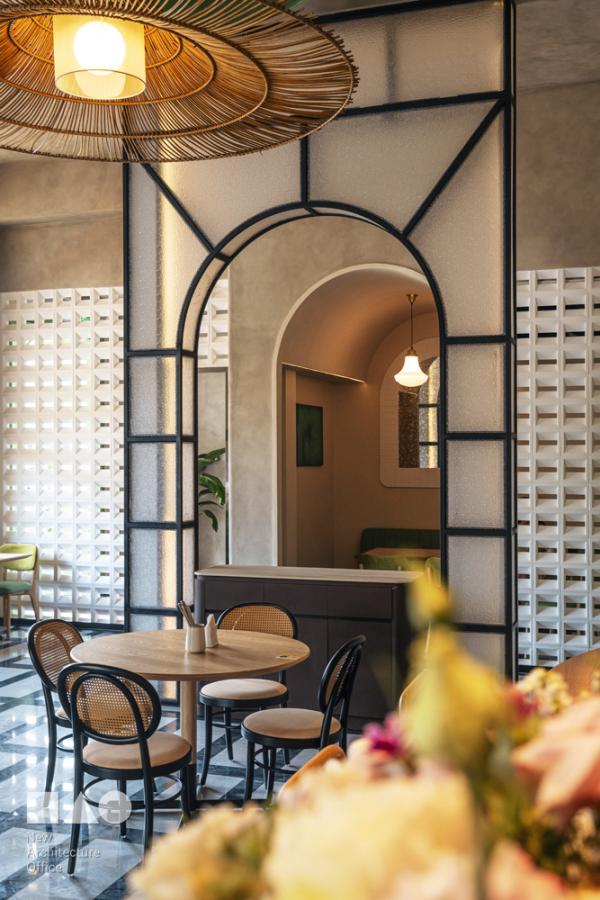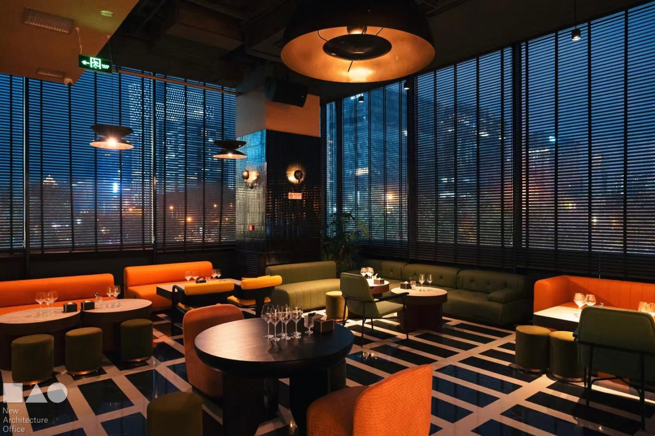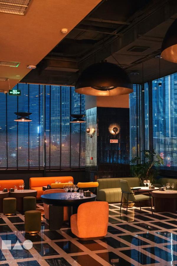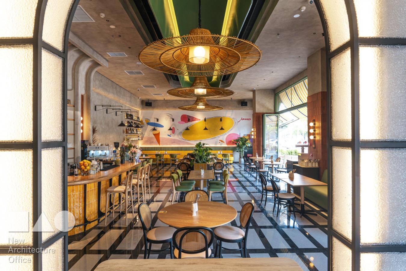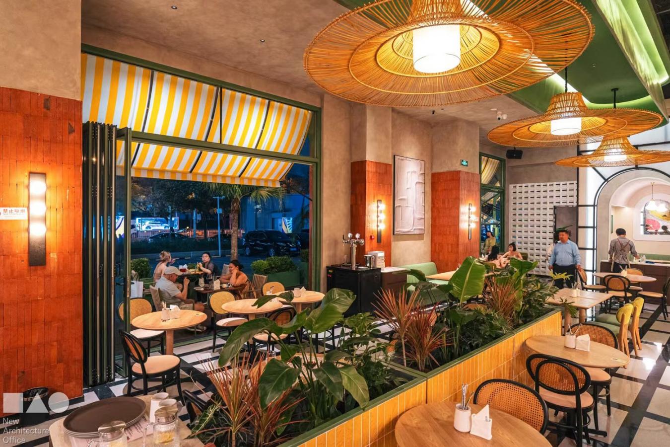 Amaro is two story space located directly across the street from the Beijing Workers stadium. The ground floor and terrace house a mediteranean bistro, while the second floor lounge is a nightlife focused destination. The restaurant interior design concept exudes a playful sophistication, blending Mediterranean vibrancy with contemporary elegance. The main dining space features bold geometric flooring, soft concrete walls, and a striking mural with abstract shapes in vivid yellow, red, and blue that energize the room. Natural textures—woven rattan light fixtures, wood accents, and lush greenery—bring warmth and balance to the sleek design. The bar is highlighted with amber-toned tiles and a glowing backlit display, inviting guests into a lively yet relaxed atmosphere. Bright yellow-and-white striped awnings on the exterior and green-framed windows extend the cheerful palette outdoors, creating a seamless transition between inside and out. In the second floor lounge area, plush seating in mustard, blush, and emerald tones adds comfort and versatility, making the space ideal for both daytime bistro dining and evening cocktails. The overall design captures a spirit of casual elegance, where modern lines meet playful color, resulting in a dynamic and inviting social hub.