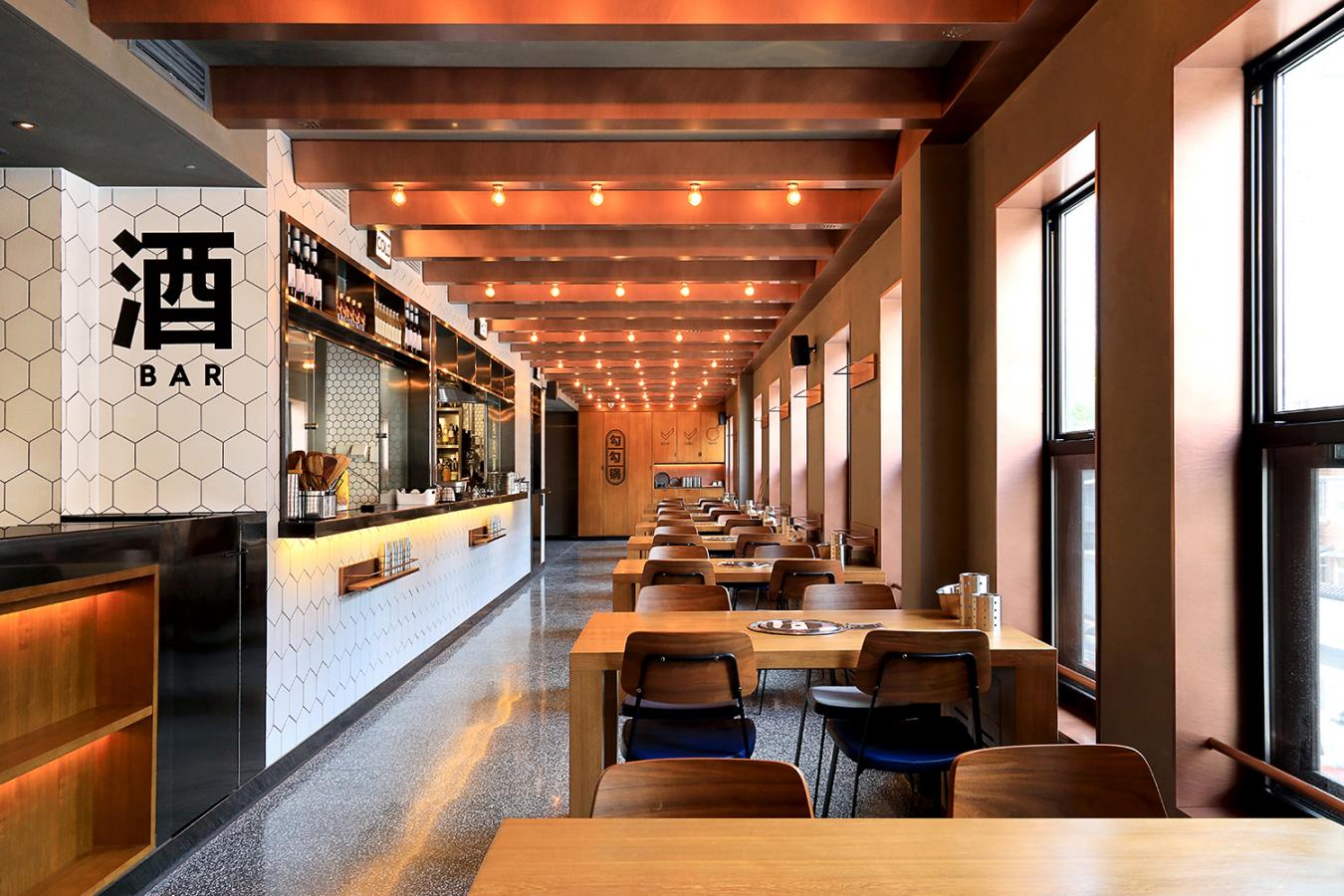 Gou Gou Guo is a fresh Korean Cuisine concept where the diner checks off each ingredient, from a listed menu, to be added to his on-table pot or skillet, thus the name Gou Gou Guo which translates to Check, Check, Pot. The restaurant is in a somewhat discrete second floor location, so in order to attract attention from passersby on the street level below. The design focus was place on creating an attractive ceiling design. The space is organized around a long linear open kitchen where the preparation of what will ultimately be cooked on the visitors table is in full display for the patrons. Material wise the space is a combination of various sized while hexagonal mosaic tiles, teak wood, and copper highlights.