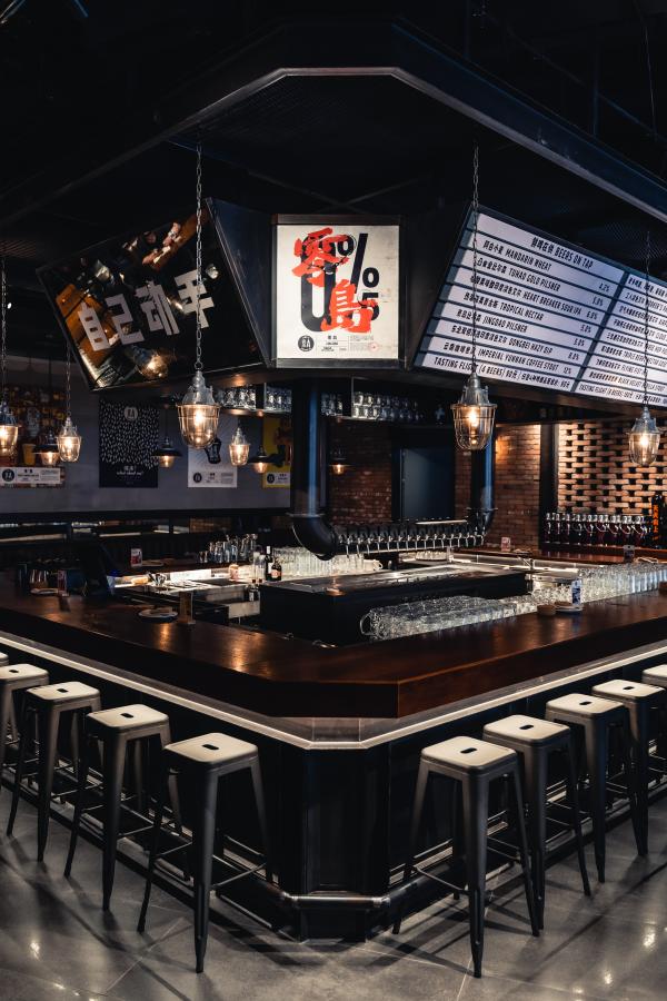 Located in the heart of Hua Mao, Beijing, this 380-square-meter Jing A Craft Beer Taproom embodies the brand’s bold urban attitude and commitment to local craftsmanship. The interior combines industrial textures—exposed brick, raw steel, and dark timber—with a warm, social layout centered around a dramatic island bar lined with custom taps. Overhead, rugged pendant lighting and large-scale menu boards recall classic brewery settings, while a vibrant graffiti-style mural featuring Beijing’s iconic dragon infuses the space with energy and local character. The design balances raw material honesty with graphic expression, creating a lively and unpretentious gathering spot that celebrates Jing A’s identity as Beijing’s original craft beer pioneer.