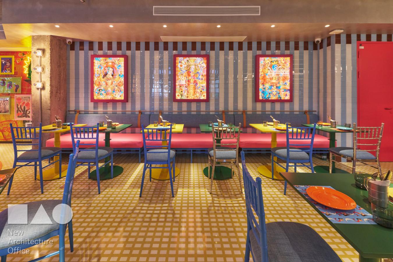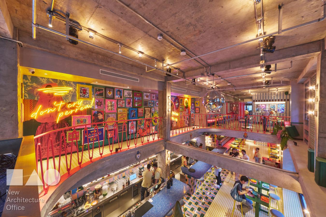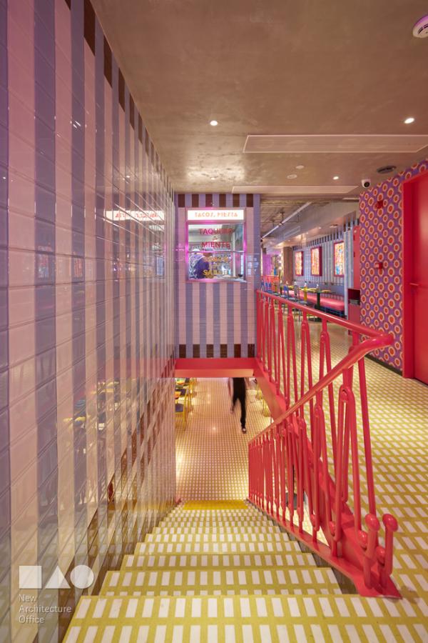 The Project is located on the 1st & 2nd Floor of a heritage building in Xuhui Shanghai. The design transforms the 1st and 2nd floor 274 sq. m. street side interior, along with a large ground level plaza into a lively Taqueria and Latin American Nightlife venue. The Concept creates a lively space inspired by the vibrant energy of Latin American and Mexican culture, reimagined with a playful, modern twist using pink, blue, and yellow tones. The bar celebrates an electric over the top aesthetic that intends to draw in a youthful crowd. Wallpaper and Mural art were designed by the Bottega in house marketing team.