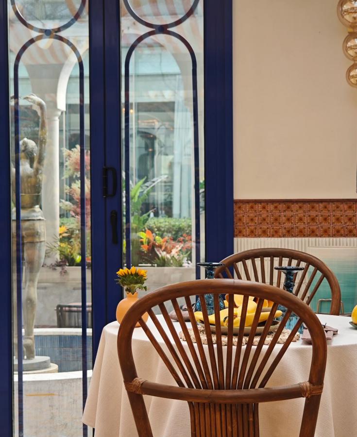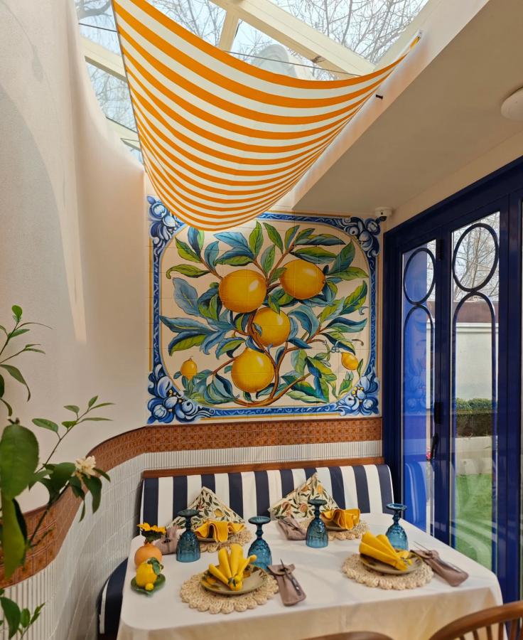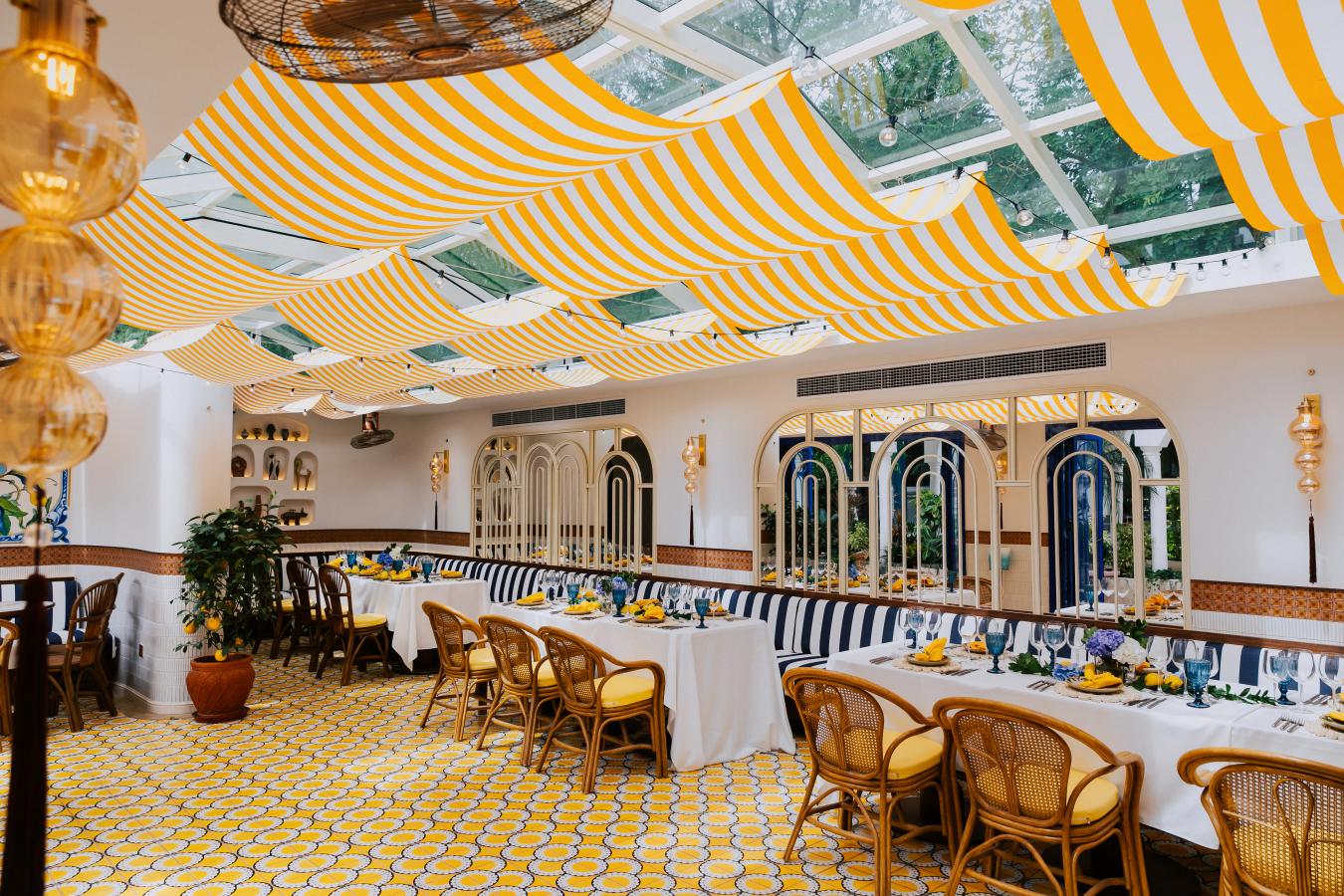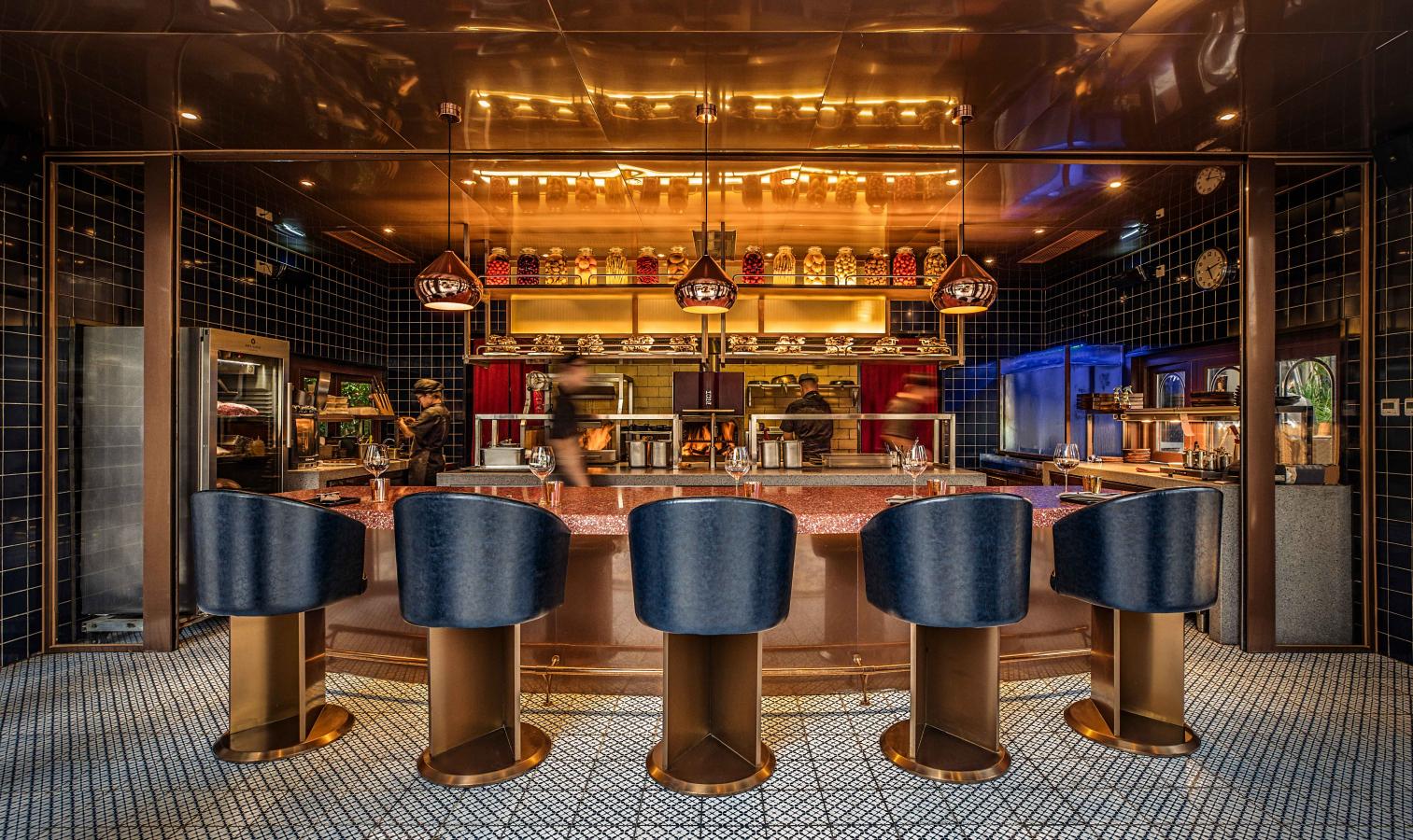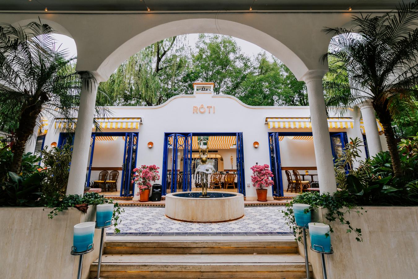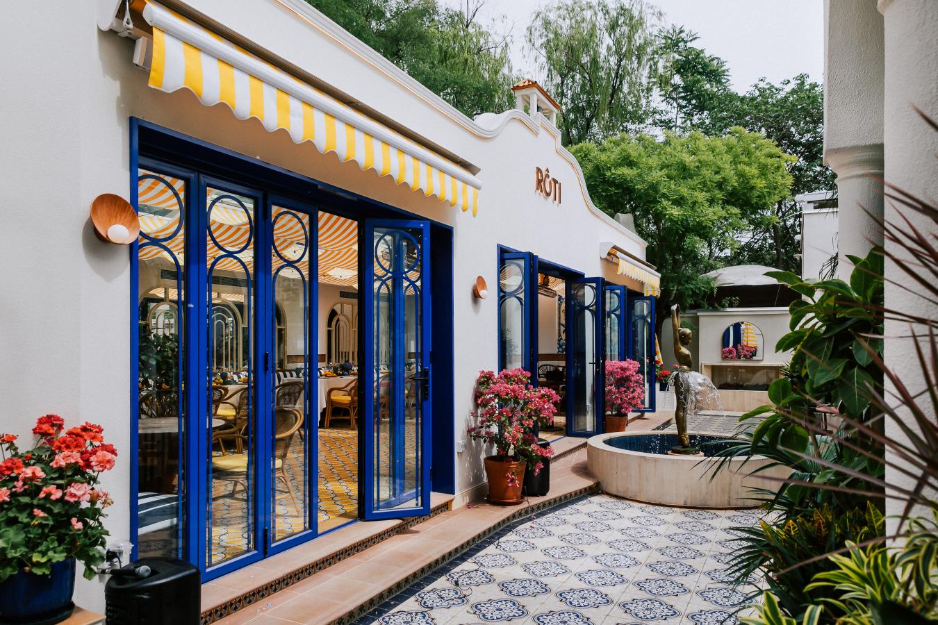 Chiara YeThe 450-square-meter Roti project was completed in two phases, creating a seamless blend of indoor and outdoor dining. The first phase focused on the terrace and kitchen, where a striking open grill kitchen and bar area were designed with bold finishes, including deep blue tiles, copper accents, and warm lighting that highlight the theatrical cooking process. The adjoining terrace evokes Mediterranean charm with patterned tiles, arched colonnades, lush landscaping, and intimate fire features, creating an atmosphere that shifts beautifully from day to night. In the second phase, a glass-enclosed dining pavilion was added, filled with natural light and accented by cheerful yellow-and-white striped fabric canopies, vibrant patterned flooring, and blue-framed windows that open fully to connect with the terrace. Together, the two phases form a cohesive dining environment that celebrates bold design, convivial gatherings, and a sense of escape.