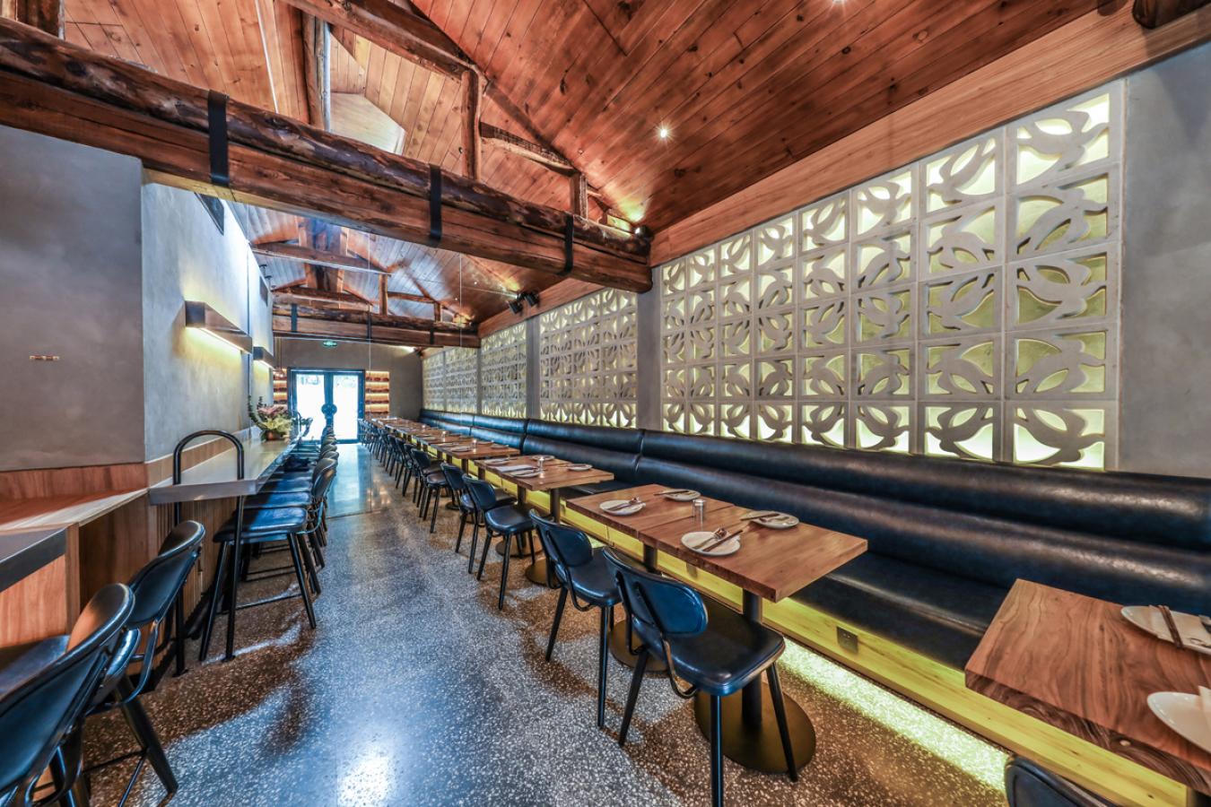 NAO brought the space back to life by demolishing walls and exposing the raw wooden beams and pillars of the traditional structure. Using a combination of elm and pine, NAO created a majestic ceiling washed in warm spot lighting. The space is accented by a signature element that runs through all four Susu locations, which is the concrete breezeblock backdrop. In the case of this Pho SuSu location the breezeblocks are molded in the shape of Chinese swallows and are back-lit to create a backdrop for the long row of banquette seating. The last major element in the space is an infinity mirror at the terminus of the space, which opens up the entirety of the room and reflects light in from the skylight above.